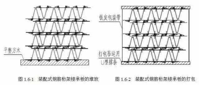 1、鋼筋桁架樓承板應遵循相同規格同垛堆放的原則。堆放時兩塊板正反倒扣為一組,堆放在平整方木上,如圖1.6-1所示。