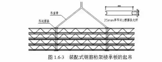 起吊時,鋼筋桁架樓承板下面和上面應設帶有U型卡口吊運木制撐條,防止鋼筋桁架樓承板變形,偏斜等問題。吊裝應設置兩個吊裝帶,間距1.6m,吊裝帶應設在桁架中部,保持起吊過程中樓承板兩端平衡,如圖所示。